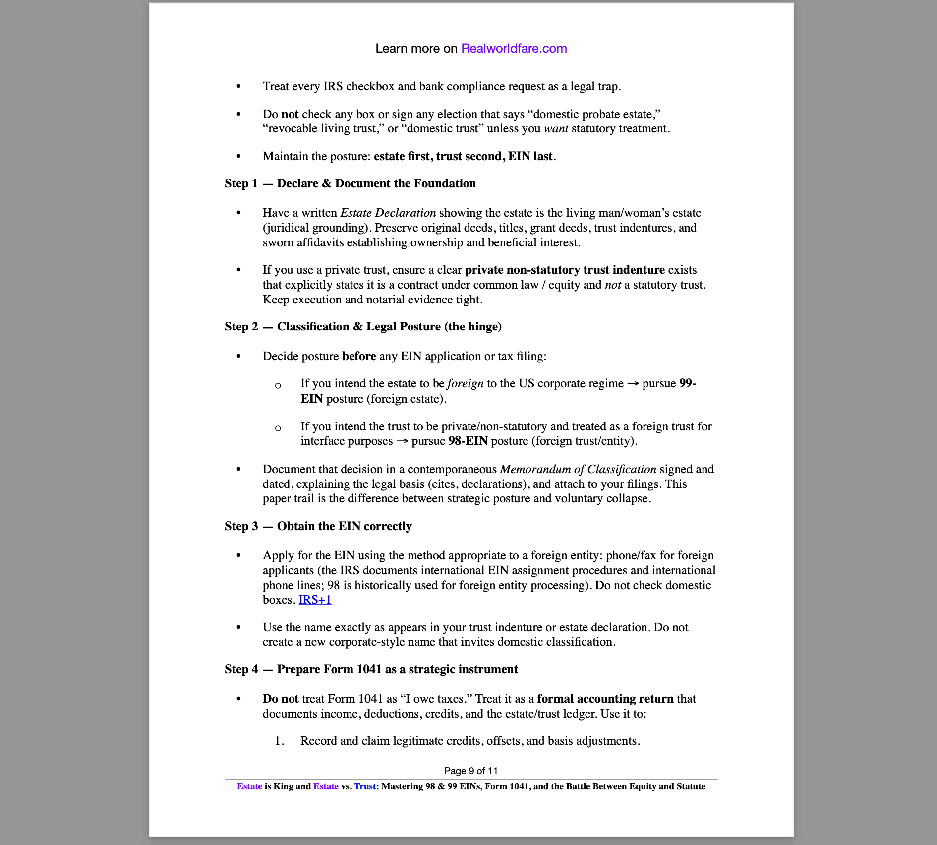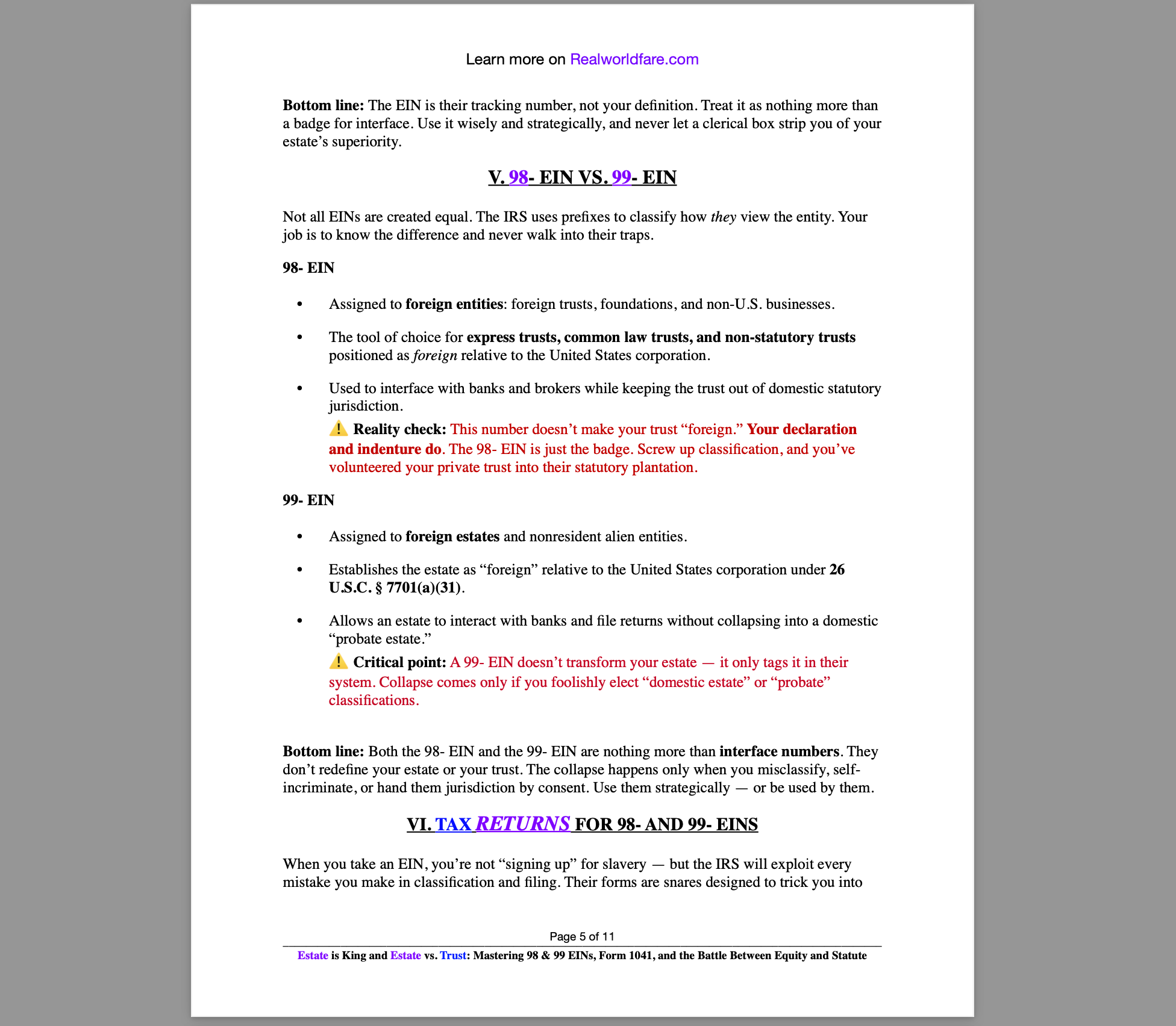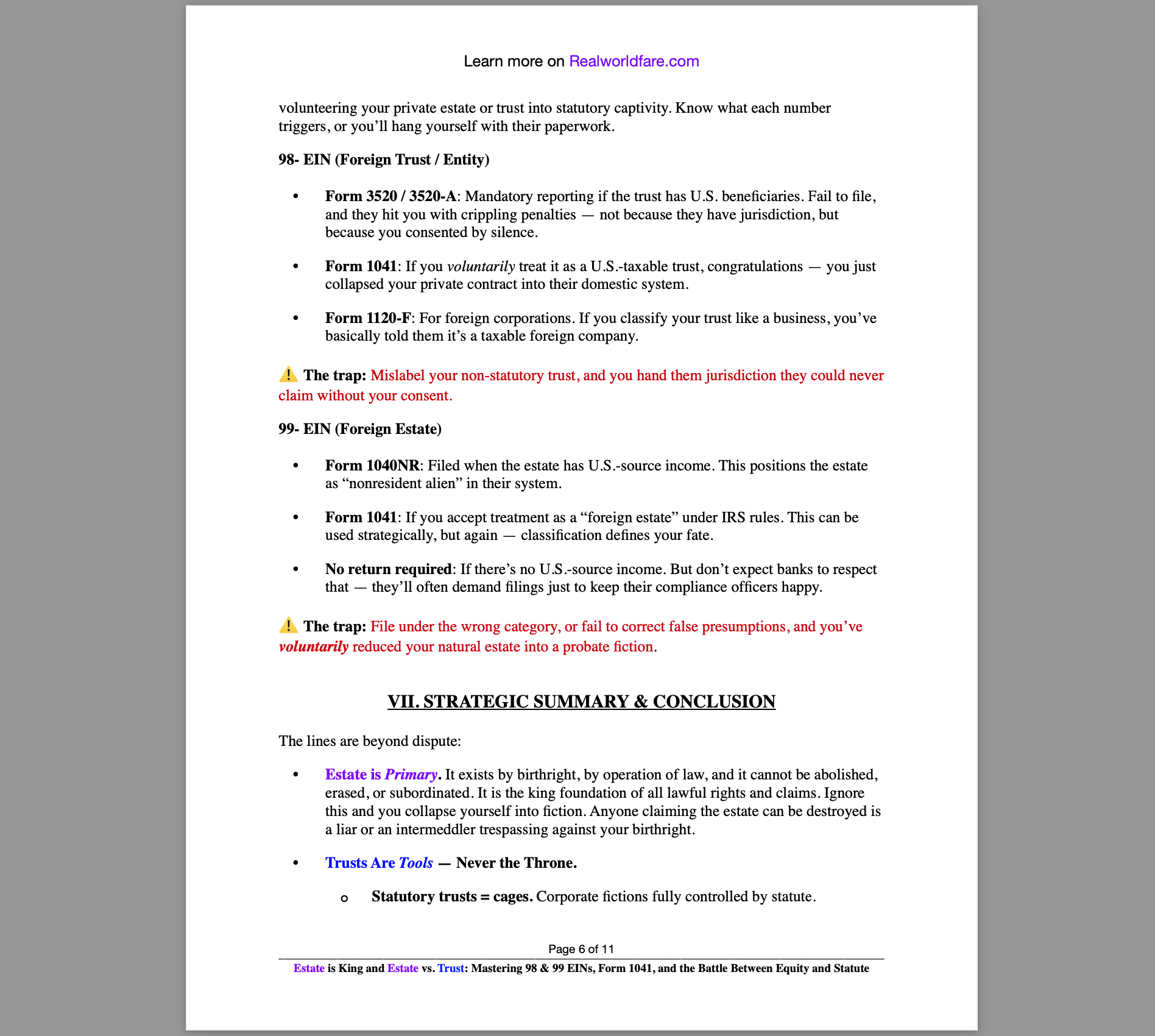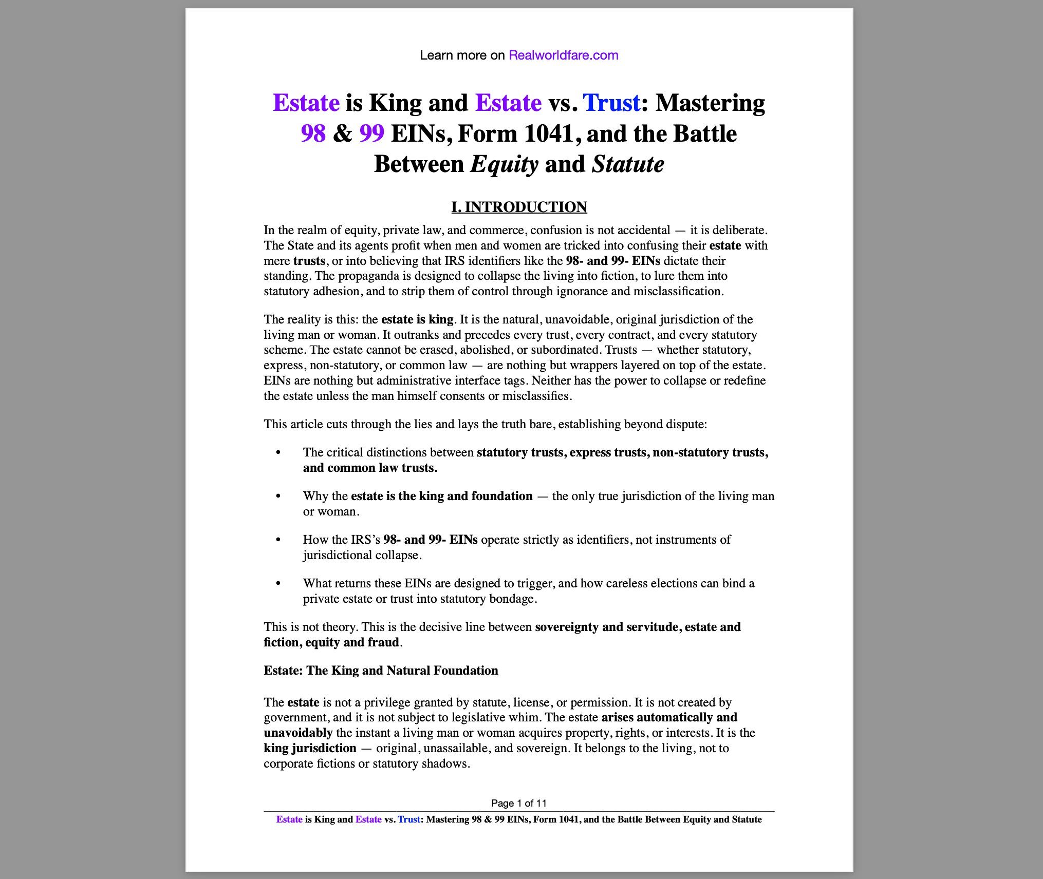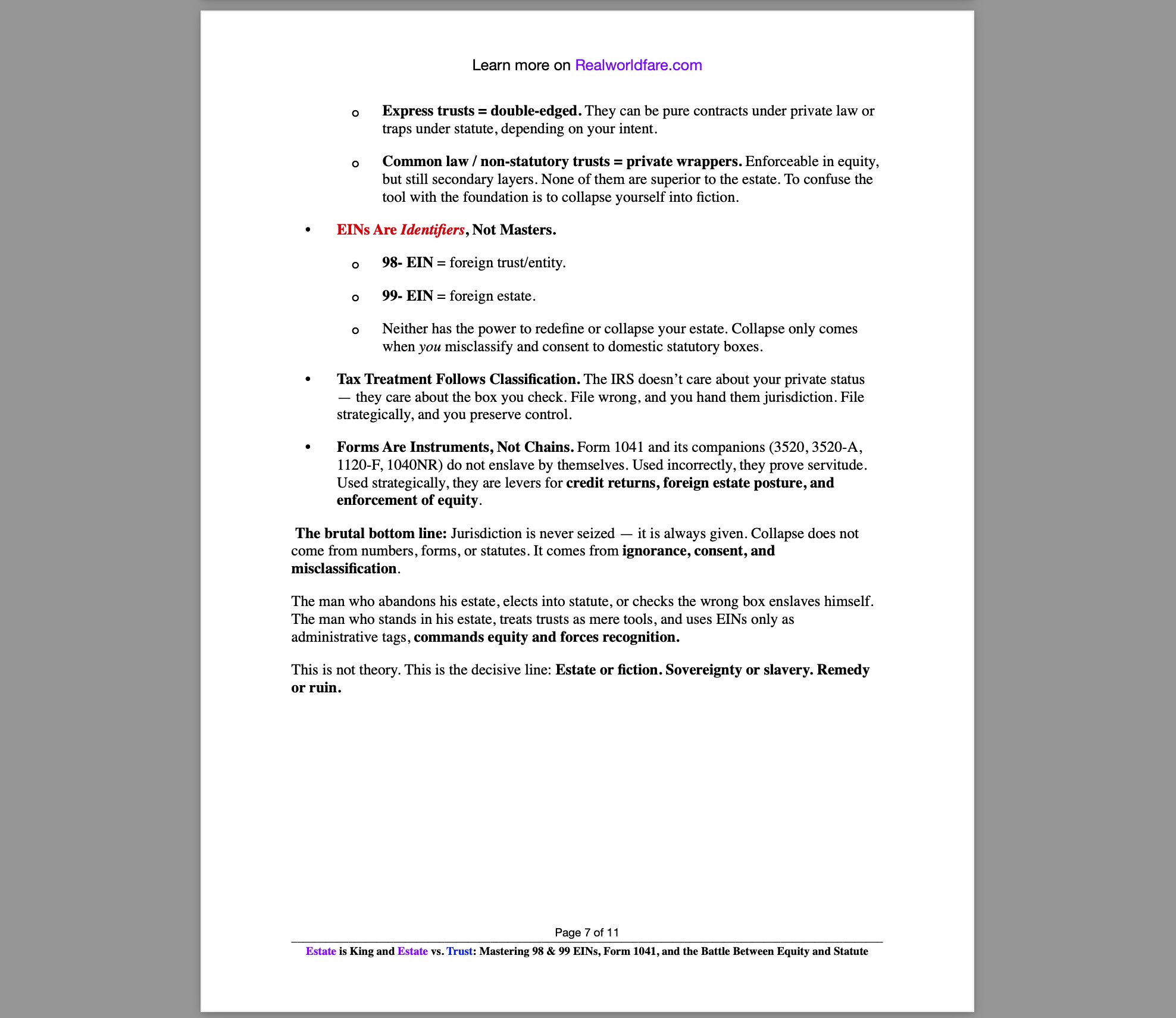 This document is a devastating exposé and practical manual for anyone navigating the traps of equity, private law, and IRS procedure. It demolishes the engineered confusion around estates, trusts, EIN classifications, and tax filings — showing with precision why the estate is king, why trusts are merely tools, and why EINs are only administrative tags, not instruments of jurisdictional collapse.