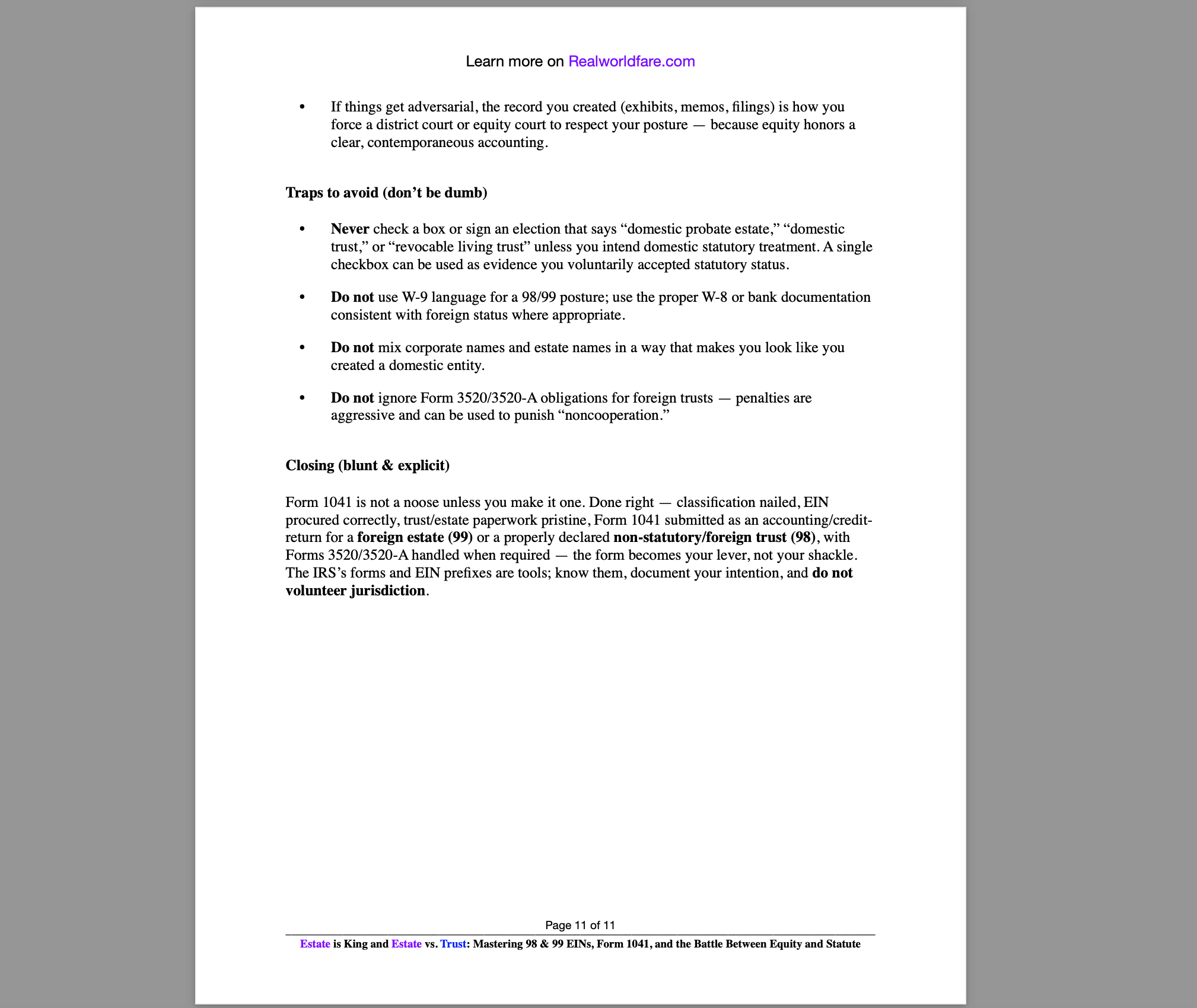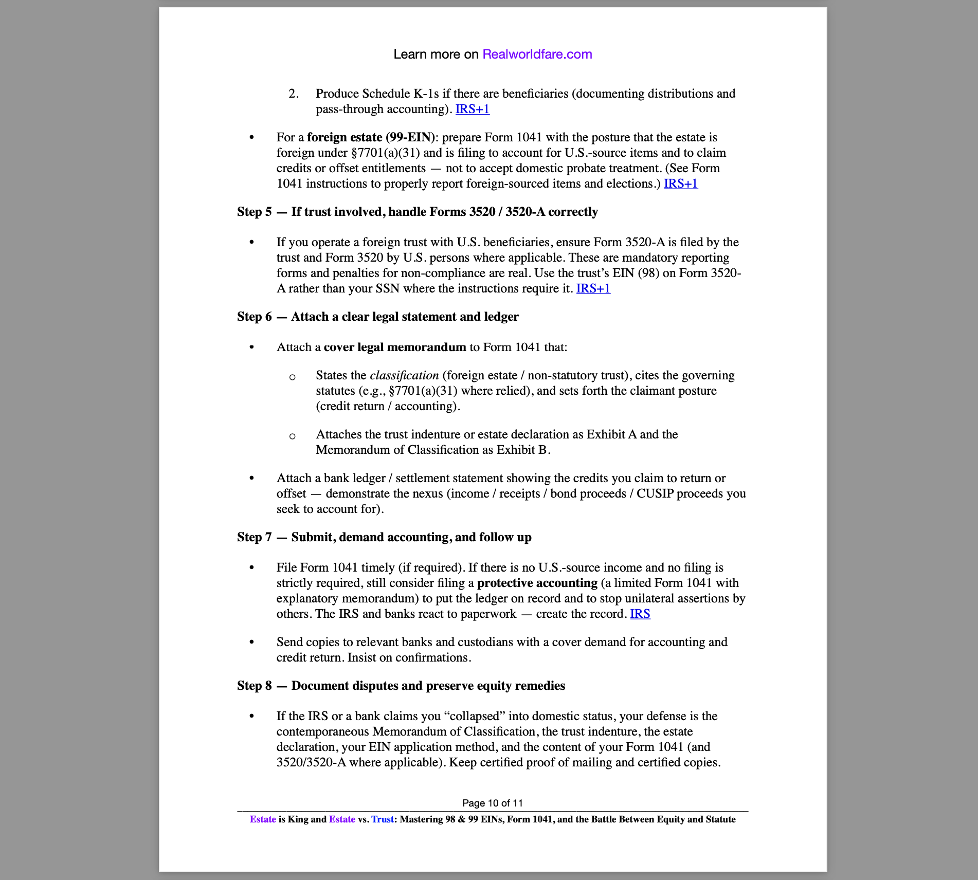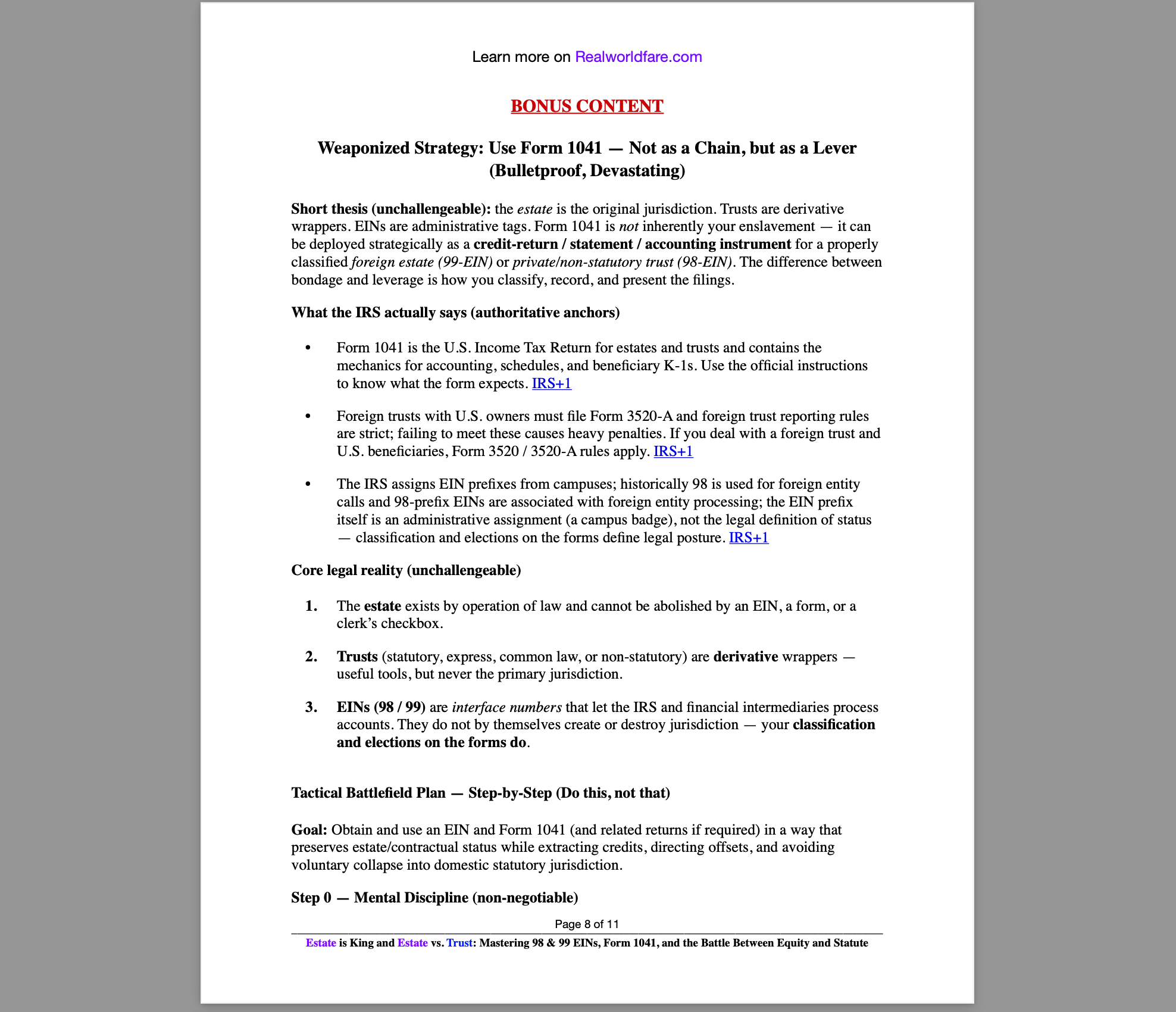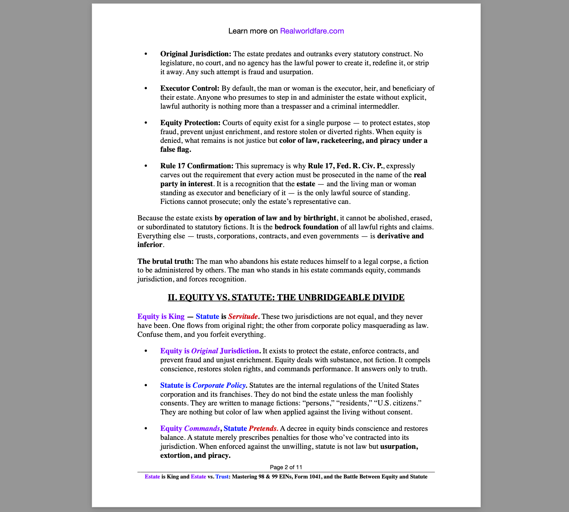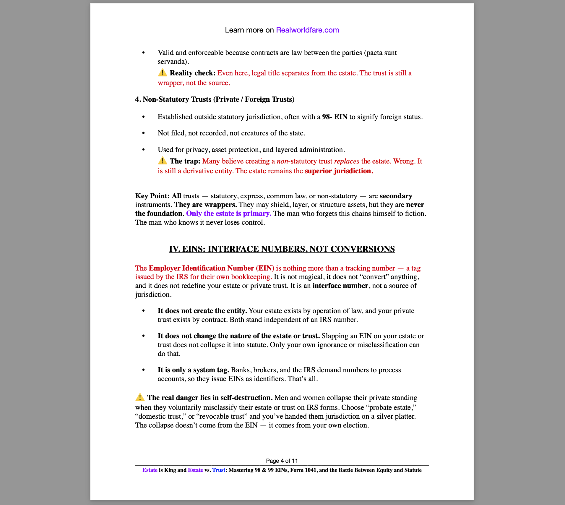 This document is a devastating exposé and practical manual for anyone navigating the traps of equity, private law, and IRS procedure. It demolishes the engineered confusion around estates, trusts, EIN classifications, and tax filings — showing with precision why the estate is king, why trusts are merely tools, and why EINs are only administrative tags, not instruments of jurisdictional collapse.